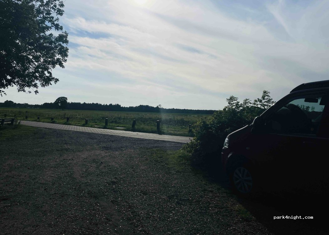 Hermoso y tranquilo espacio de estacionamiento en un lago de tamaño mediano con agua clara, completamente rodeado de hermosos árboles, maravillosa vista desde el estacionamiento hacia amplios prados y curvas, con tiempo despejado y puesta de sol. Nosotros recomendamos. >> Precaución, designación de dirección incorrecta. Correcto es Meppel "Weg naar de Bloemen". Estamos parados aquí y comprobados.