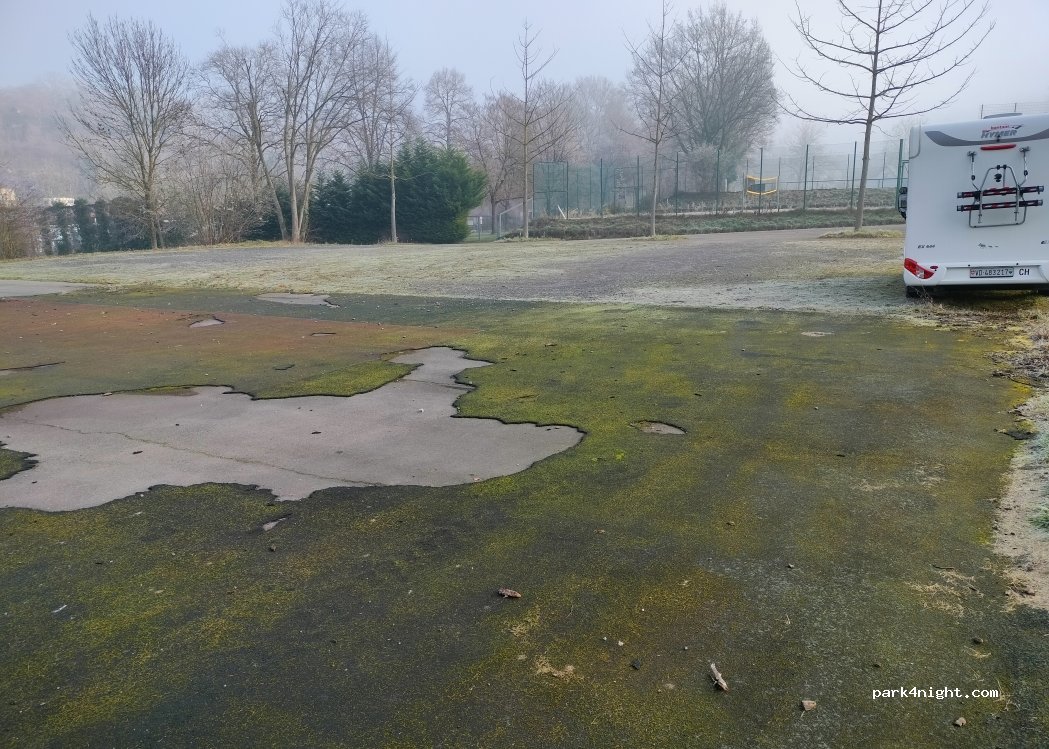 Ongeveer 200 m verder dan de officiële camperplaats, vlak rond het sportveld, achter het zwembad ligt een mooie grindparkeerplaats. Aangenaam vlak en stiller dan verderop. Toiletten en douches in het zwembad. Ik was erg eenzaam omdat de badkamer gesloten was. Er staan hier inmiddels veel busjes, campers en caravans. Soms dagenlang. Volgens sommige kampeerders geeft de badmeester bij het buitenzwembad toestemming om hier te kamperen. Als u een lange kabel bij u heeft, kunt u mogelijk ook elektriciteit krijgen van het buitenzwembad.