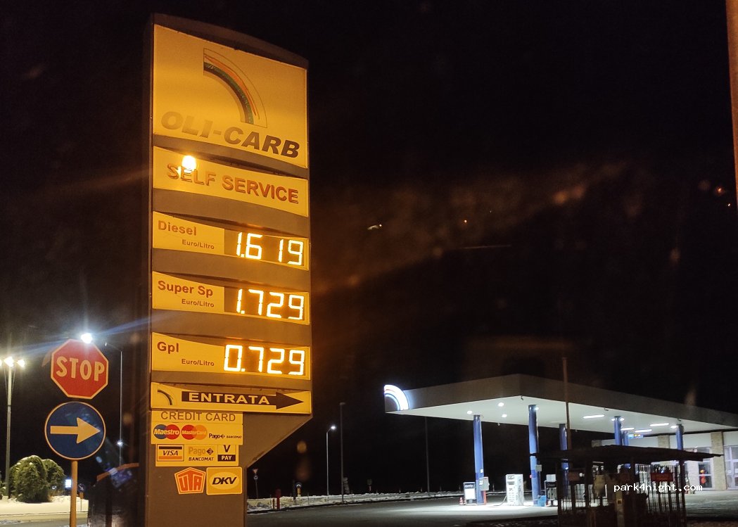 Novembre 2024. Ore 22. Passiamo per scaricare le grigie ma troviamo due auto parcheggiate sul tombino di scarico. Peccato perché sarebbe stato molto comodo. Facciamo però gasolio e AdBlue, comodo distributore.