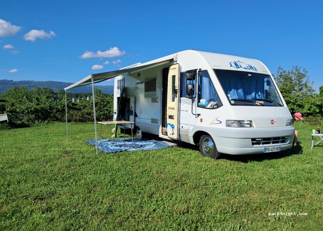Sehr schöner ebener Stellplatz am Rande einer Kirschen Plantage. Man kann direkt vom Stellplatz kleine Spaziergänge machen. Am Hof gibt es frisches Wasser ab eigener Quelle.