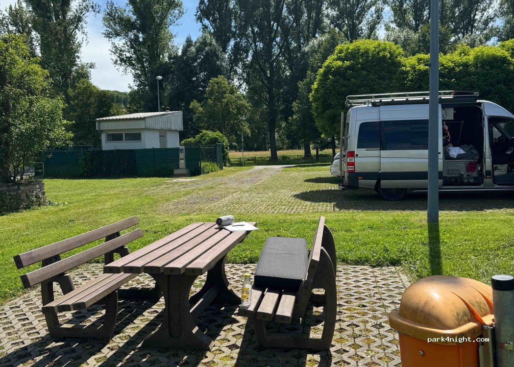 Very quiet site, on the edge of a small village, 3 ample sized pitches each with own electrical supply at 50cents fer kwh. 50 cents for 2minutes of water. No toilet or washing facilities & a small bin for rubbish. There is a picnic bench to sit at also.