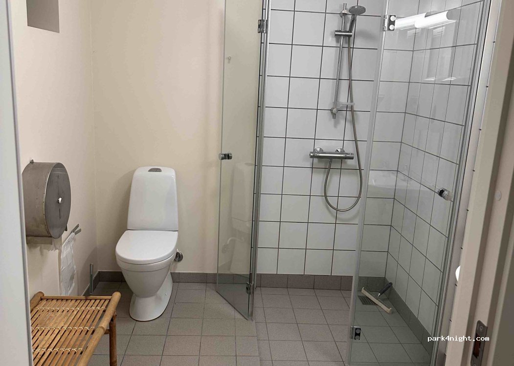 Nous avons passé une très bonne nuit sur ce parking. Beaucoup de voitures jusqu'à 20h30 (le restaurant de la marina a du succès) puis c'est le calme plat. Paiement sur internet (QR code sur le panneau, 150kr), le code des sanitaires est envoyé après paiement. Il y a 4 belles salles de bain propres (toilette, lavabo, miroir et douche avec paroi en verre), comme à la maison !