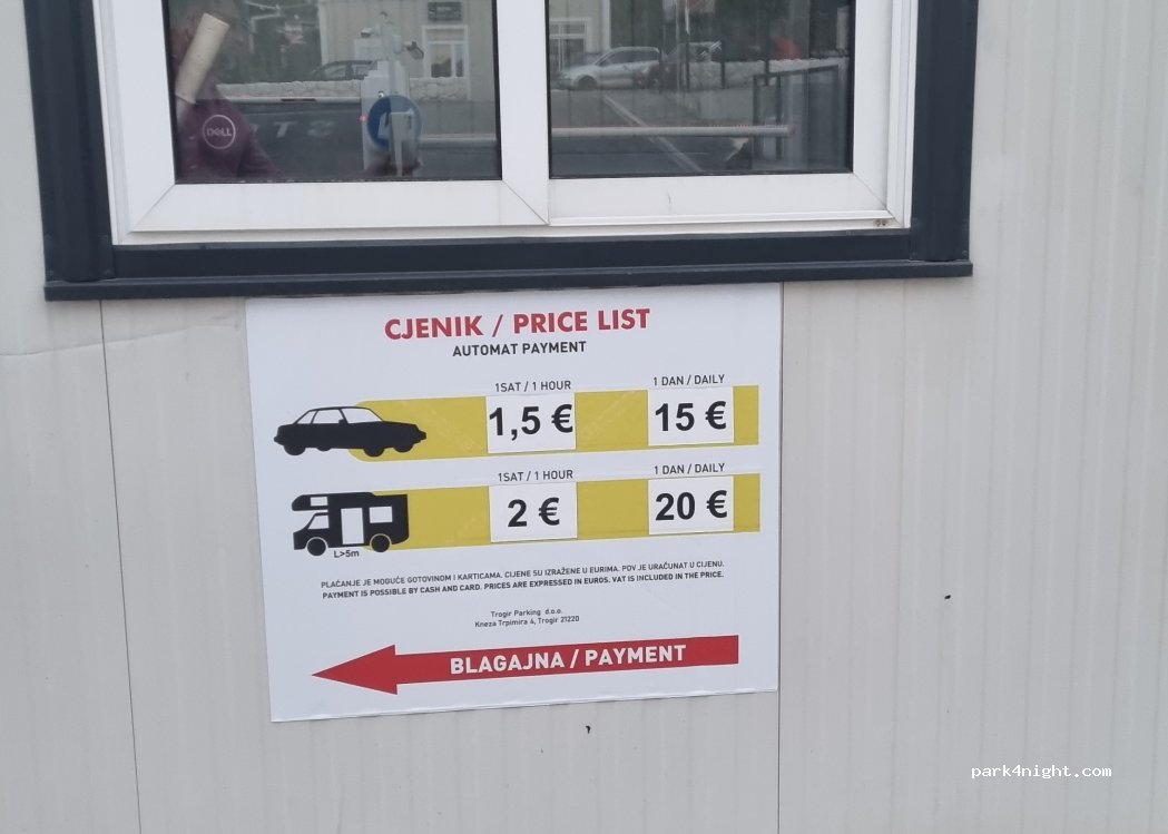 100 Kuna pour 24H, nuitée possible, le bruit le week-end peut-être dérangeant. Derrière le parking il semble y avoir un marais, des dizaines de moustiques dans le camping-car même en étant prudent! Très bon emplacement, ville magnifique mieux vaut visiter Trogir que Split!!!