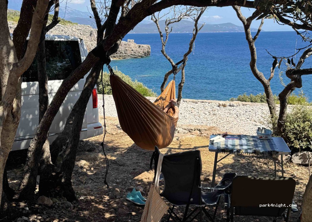 Toller Spot , der durch schmale Straßen maximal für Kastenwagen gut zu erreichen ist. Viele schattige Plätze, direkter Zugang zum Meer und ein Imbiss mit super Service. In wenigen Gehminuten ist ein Kajakverleih-ca 1 Stunde bis zur Blue Cave. Punkt Abzug wegen dem erhöhten Preis und den sanitären Einrichtungen(nachts tummeln sich dort Heuschrecken)