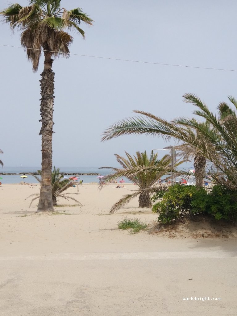 Plage sable fin public avec douche très propres , bien mieux que à rimini où toute les plages public sont degeulasses sans douches , place bleu gratuite la semaine , attention payant le week-end ! J ai vu quelques camping car le long de la route , j suis en van vw aucuns problèmes , spot idéal pour passer l aprèm tranquil sans raquer