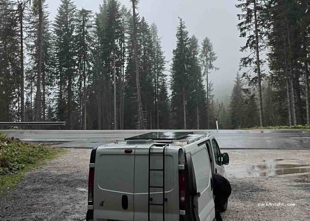 parking en bord de route, avec peu de circulation la nuit. nous avons passé 1 nuit ici avec 3 autres vans. idéalement placé pour la randonnée vers le lac de sorapiss et pour rejoindre tre cime suffisamment tôt pour le sunrise