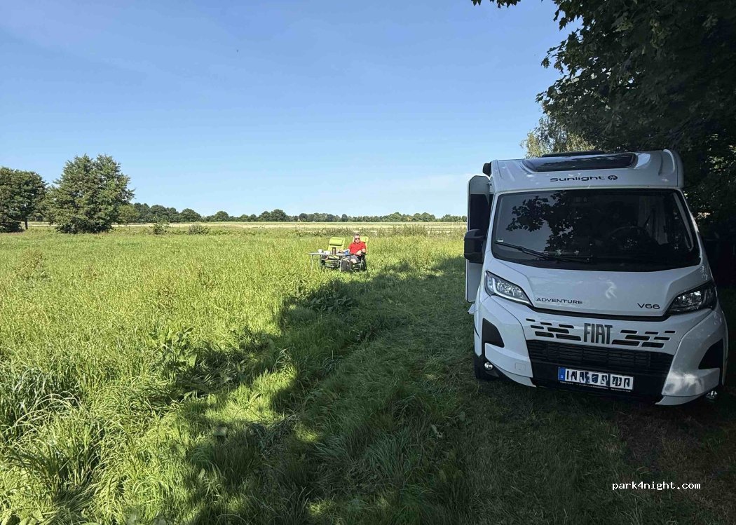 Ein schöner Blick über Wiesen ins Grüne. Dank des Eigentümers und toller Mitcamper hatten wir einen sehr lustigen und geselligen Abend. Heute haben wir eine tolle Radtour zur Nordsee gemacht und werden jetzt den Abend gemütlich ausklingen lassen. Wir stehen autak, insbesondere Strom/Wasser wäre aber möglich. Wir sehen uns wieder!