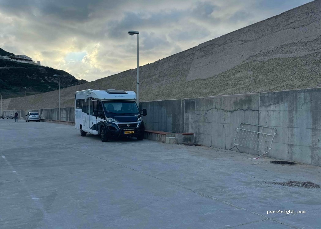 Situé face au port de pêche, aucun services,nous y avons passé la nuit au calme sans aucun soucis, un supermarché est situé à 5 minutes à pied, ainsi qu’une laverie, il est recommandé de ne pas sortir table et chaises