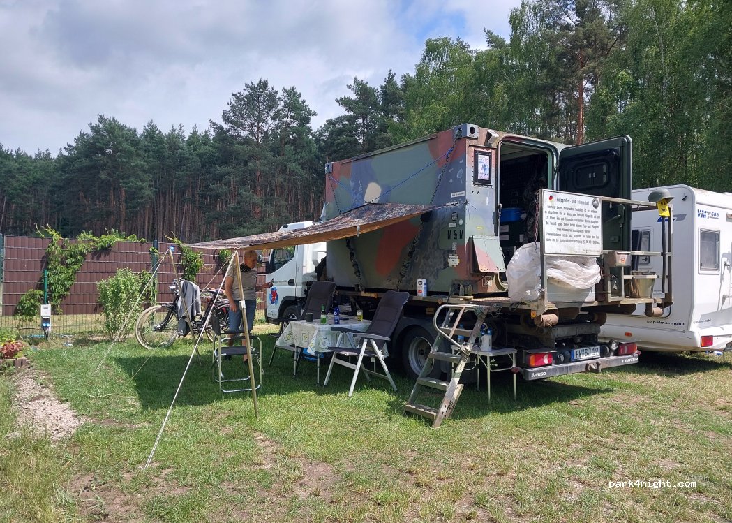 Sehr ruhig und nahe am Baggersee- mit Stromversorgung- Duschen- Toiletten und Müllentsorgung natürlich auch Wasser zum auffüllen und der Platz ist sehr ruhig aber sehr teuer und schräge Plätze/80% (Preise 15€ pro Person und Hunde 7,50 € )da bin ich an die Oder gefahren wo man auch Angeln kann denn das war mir das Geld nicht wert für mehrere Tage