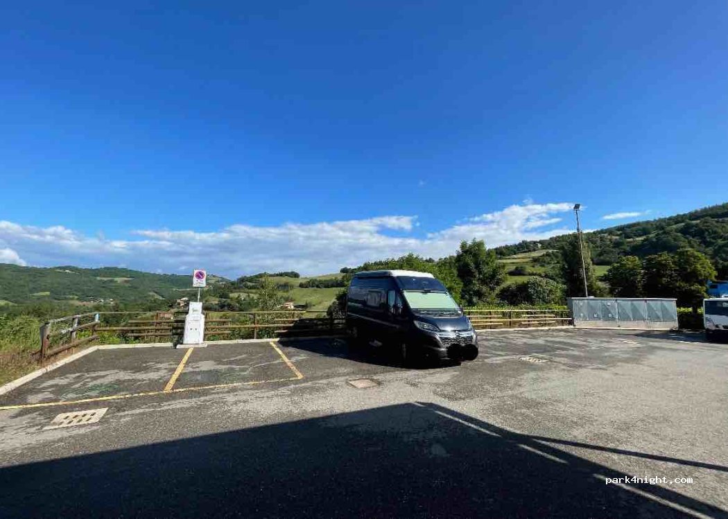 Pretty little village and warm welcome. Great fresh pasta from cafe and local wine. Surprisingly noisy at night though with an almost constant stream of traffic., except for 11pm to 5am. Parked on side of road in front of the church no problem, locals helped us and confirmed it was ok to park and stay.