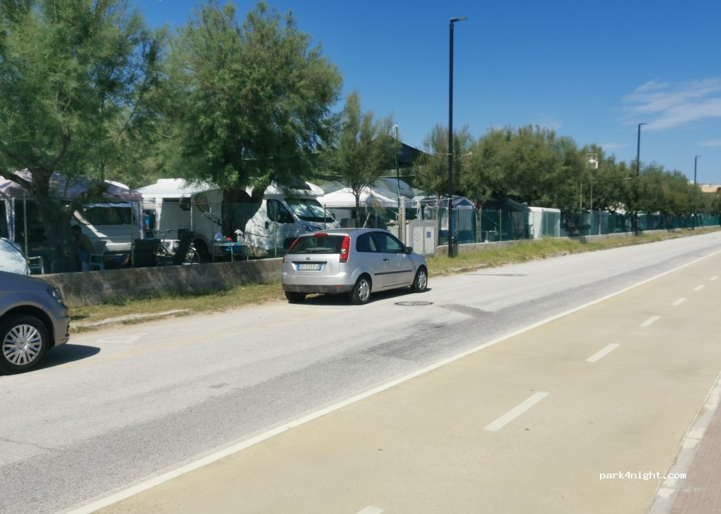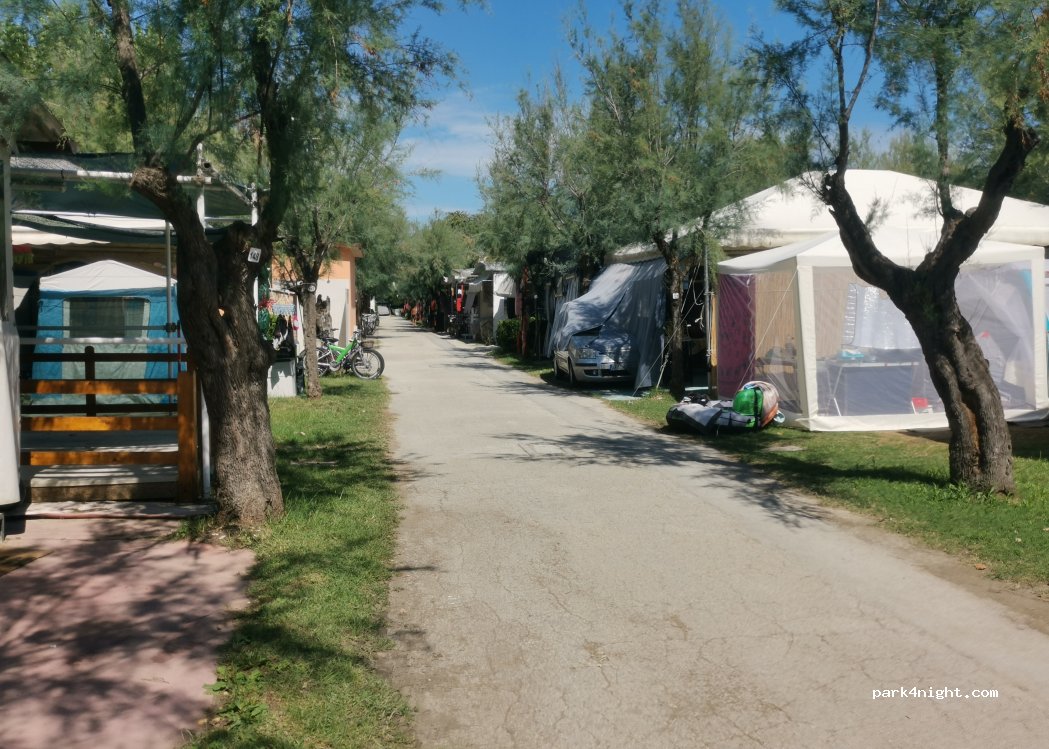 Campeggio con piscina, separato dal mare, da strada e ciclabile. Servizio cordiale e disponibile. Prevalentemente occupato da stanziali, roulotte/veranda e tendaggi vari. Le poche piazzole disponibili sono parzialmente ombreggiate, di discreta metratura per un camper da 7 Mt. con allaccio elettrico 4 AM e carico acqua. Non dispone di scarico acque grigie?! Servizi datati ma funzionanti, docce a pagamento. Ristorante pizzeria adiacente. Spiaggia di sabbia attrezzata e poco frequentata, battigia a scendere molto lineare, ottima per bimbi, sicuramente migliore, andando verso Marotta, con acqua più sporca e di sabbia/sassi. La linea ferroviaria passa adiacente al campeggio, con treni a tutte le ore. Nel complesso, a mio avviso, risulta il meno peggio della zona. Piazzola camper e due persone € 37,50 a fine Luglio.