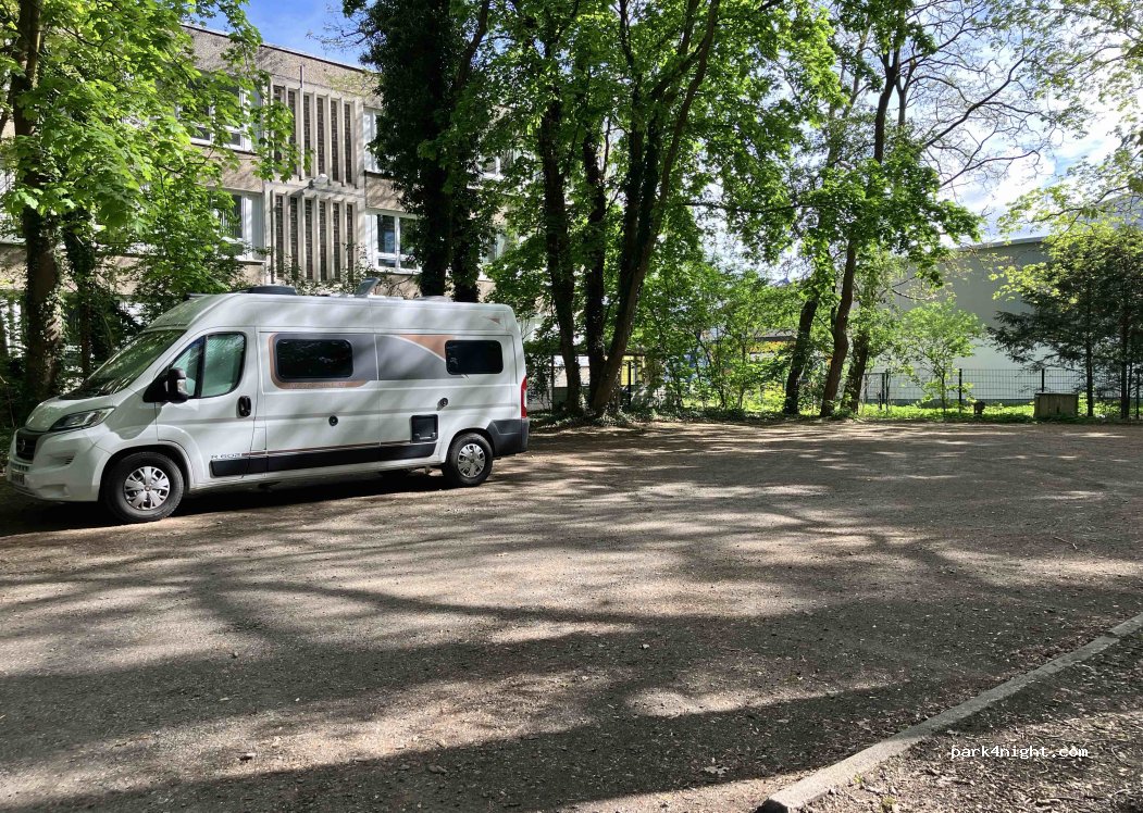 Nous y avons passé une nuit tout au fond du parking. Nous étions tous seuls. Endroit très tranquille juste à côté du stade et d'un grand parc. Les voitures arrivent à partir de 8h00 mais cela n'est pas un problème. Lidl à 600 m. Aucun service.
