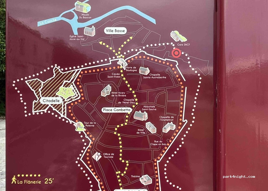 Parken am Bahnhof. Nachts viele Plätze. Relativ ruhig. Gut beleuchtet. Kein Parkverbot für Wohnmobile. Einige Tageszüge verkehren nach Étaples Arras. Schulbushaltestelle in der Nähe.