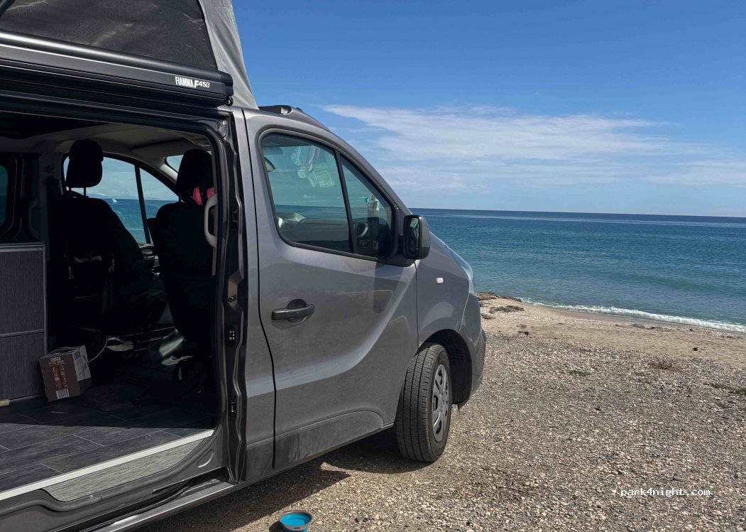 Buen lugar, primera línea de playa. Dormimos dos noches. Algo de ruido pues es una carretera, pero tranquilo y escuchando el mar. Pese a la prohibición de no sobrepasar los 5 metros de longitud, la policía pasó varias veces y no nos dijeron nada. Bares, tiendas y supermercados cerca. CORRIJO!! Me acaba de llegar la denuncia. 80€ 50% si pagas pronto por permanecer con vehículo de mas de 5 metros.