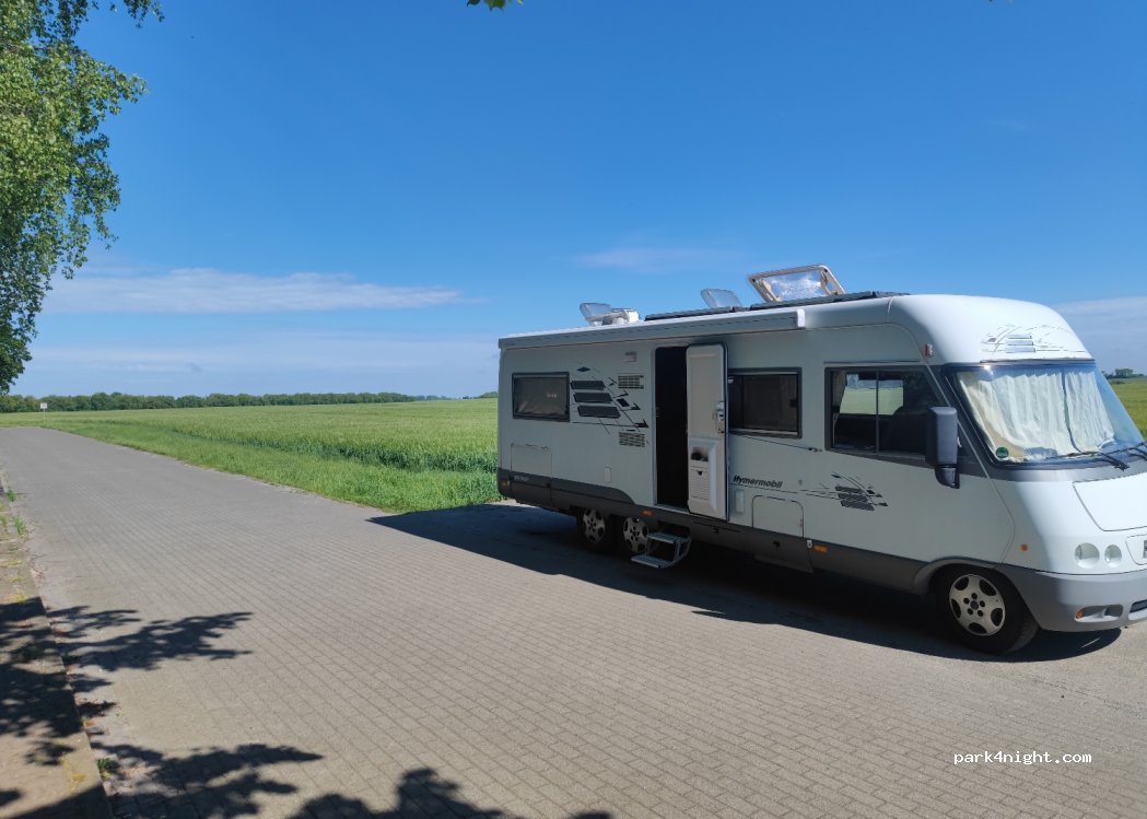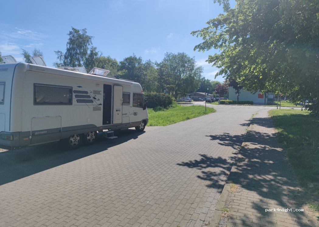 Ein kleiner ruhiger Parkplatz an der Bushaltestelle einer Schule. Nahe dem Fährhafen Richtung Rügen. In den Ferien (von Mecklenburg Vorpommern) nicht stark frequentiert.