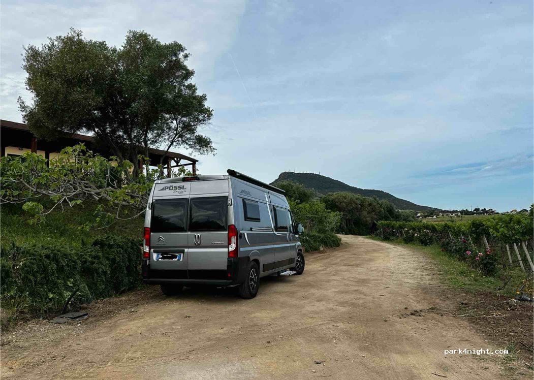 In Verbindung mit einer Weinprobe (45€ pro Person) ist der Stellplatz kostenlos. Das Weingut bietet einige Stellplätze auf einem Schotterplatz mit einer schönen Aussicht auf die hauseigenen Weinreben und das Meer. Ein Appartement steht für die Camper zur Nutzung zu Verfügung, Bad mit Dusche und WC + Küche. Die Weinprobe selbst umfasst 7 Weine, vers. Käse, Oliven, Wurstplatte, gegrillte Salsiccia.