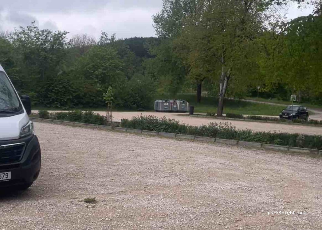 Normaler Parkplatz bis 6,50 Meter möglich. Mülleimer und Altglas Container vorhanden. Sand Schotter Gemisch. Etwas weiter weg von der Straße.