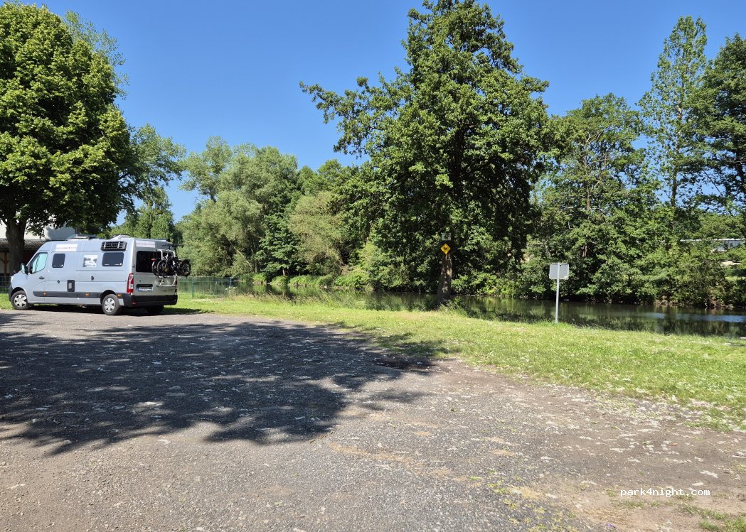 Nice and quiet place for one night next to the river and far away from any noise. Some friendly fishers and joggers. Tranquil place to park under trees in accessible and tolerated nature. No services around, no toilets available.
