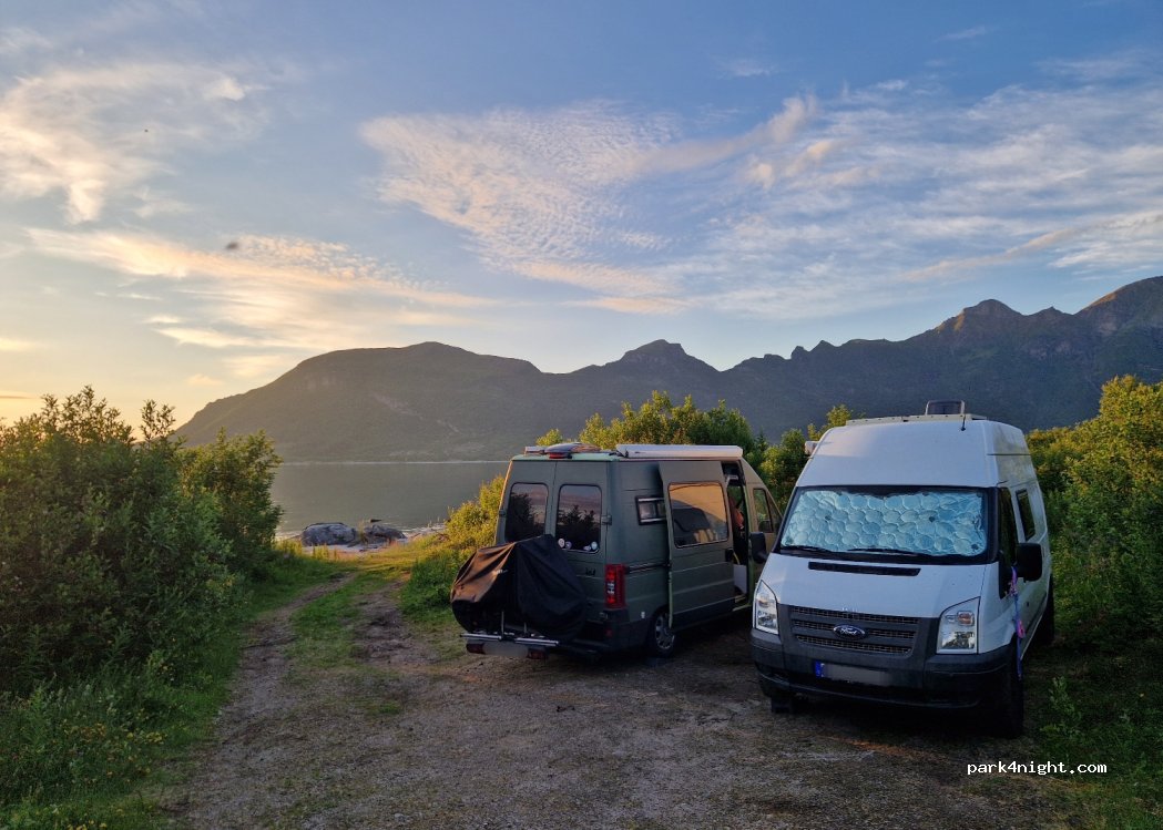 schöner Platz mit feinem Sandstrand, 2 Parkbuchten für Vans bis 6 m, Blick mit Sonnenuntergang inbegriffen