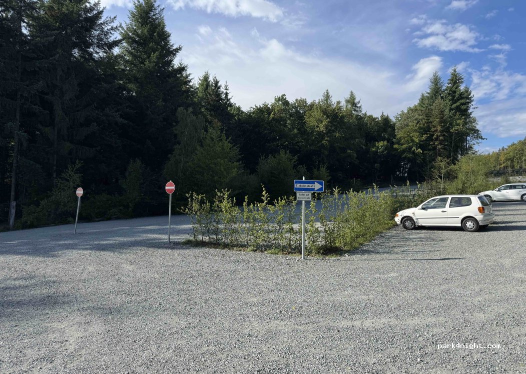 Motorhome parking lot next to the Nepal Himalaya Temple Wiesent. Cars are also parked during the day and very quiet in the evening.