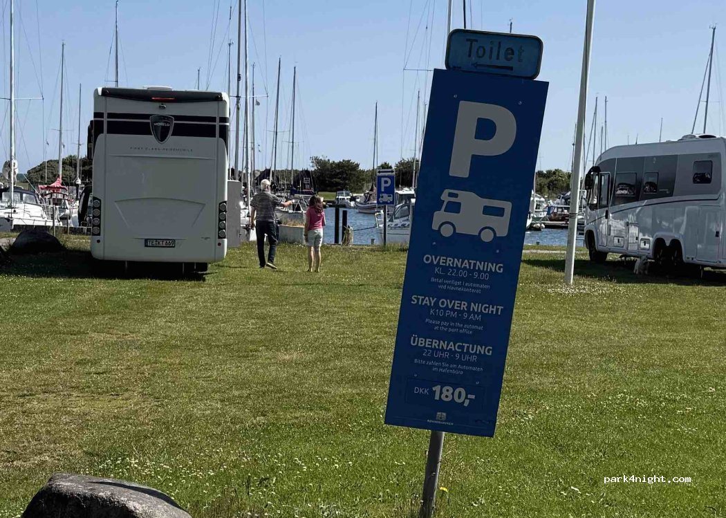 Toller Stellplatz, direkt an einem kleinen Bootshafen. Die Toiletten befinden sich direkt beim Kassenautomat. Sogar W-LAN und Chemietoilettenentsorgung vorhanden. Preis für Camper von 22-9 Uhr 160 DK