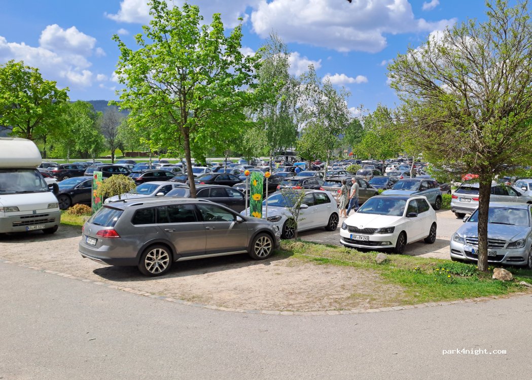 am Ende des Parkplatzes links um die Ecke fahren - gegenüber der E-Auto-Ladesäulen ist man weiter von der Straße weg. Parkt dann direkt am frei zugänglichen Freigelände, geringe Schräge. Anfang November am Wochenende 5 Wohnmobile.