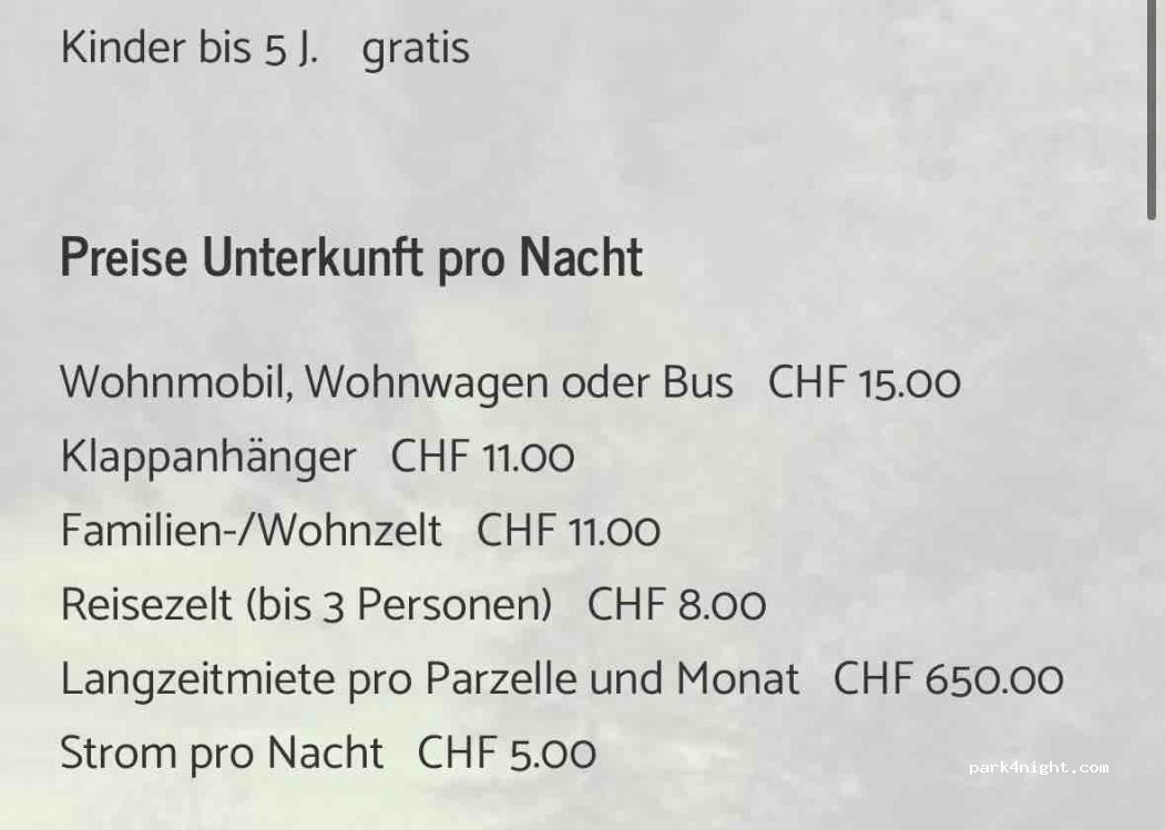 15chf / motorhome + 11chf/adult + 5.50chf/children