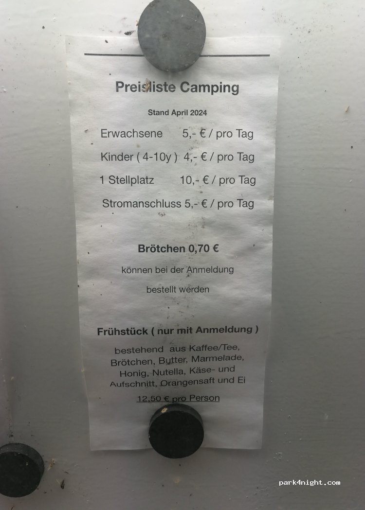 Best stop on the route south/north!! Very uncomplicated - register in the restaurant, choose your spot, and if you like breakfast or just some rolls in the morning you can order that as well. We would definitely recommend dining in the restaurant! The owners are lovely, the food is excellent, and the beer tasty. 20€ without electricity, 2 p. 0,70€ per roll 12,50€ breakfast restaurant