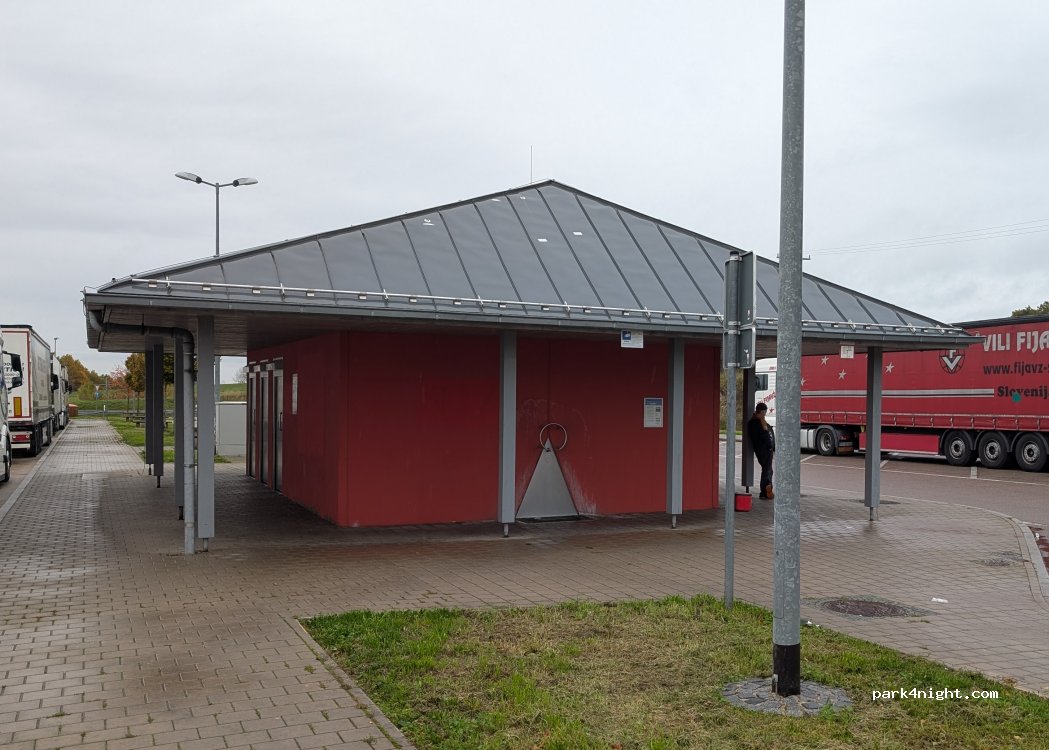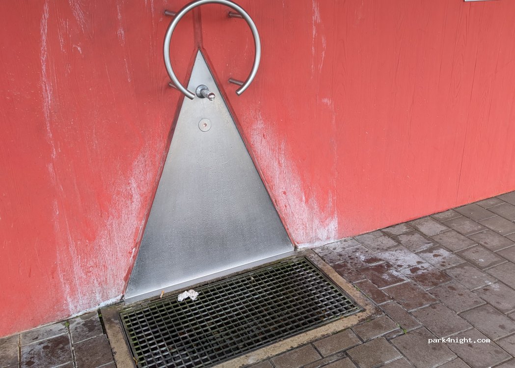 Am Toilettenhaus ist außen ein Wasserhahn. Kanister können hier aufgefüllt werden. Die Lkw-Fahrer füllen hier ihre Trinkflaschen auf.