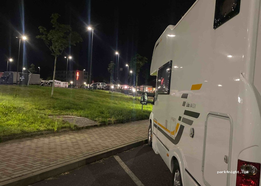 Good park up but very busy at night. Full of truckers so no Campervan reservations.. Park where you can.... Shopping and restaurant.. Very quiet...