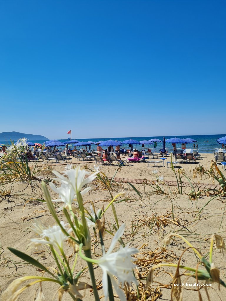 area sosta curata con alcune piazzole più all'ombra (sotto la pineta) ed altre più soleggiate. corrente e acqua (non potabile) in piazzola. collegamento diretto con la spiaggia poco frequentata e tranquilla. servizio spiaggia con ombrelloni e sdraio disponibile a 10 euro. docce fredde esterne, docce calde a pagamento. proprietari cordiali e disponibili servizio bar