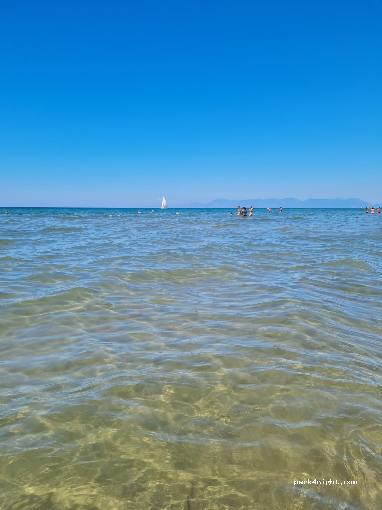 Schöne grosse Stellplätze und sehr netter Chef. Platz mit Strom 23 Euro ist ok. Durch das Wäldchen ca. 100 m zum Sandstrand. Heisswasser beim Geschirr wäre super. 50m vor den Stellplatz gibts Pasta Fresca, unbedingt holen!