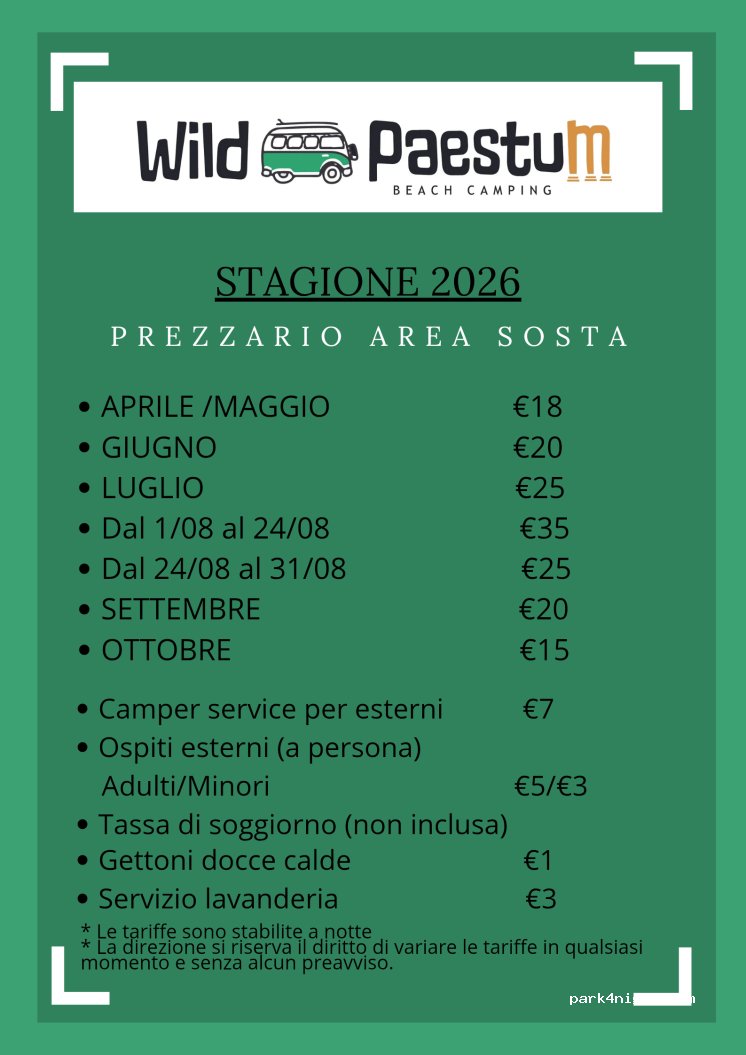 Penso se stia parlando dell'area sosta Wild Paestum perché l'area segnata e proprio questa.Nuovissima area sosta a 100 mt dal mare,(e che mare)attraversando una bellissima pineta.Prtp essendo nuovo non c'è ancora ombra ma il posto e validissimo,servizi in legno molto carini ma prtp le pulizie vanno fatte ragazzi anche se dentro c'è 1 solo camper 29 eu per 1 notte 3 adulti 1 cagnolino a Settembr