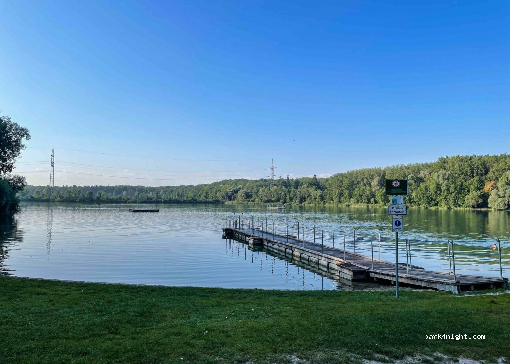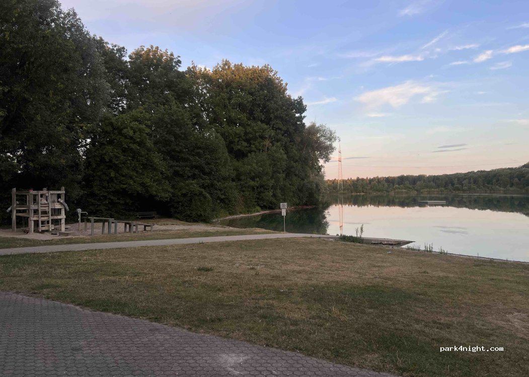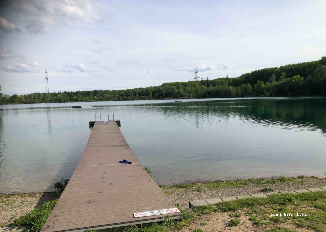 Nicht beleuchteter Parkplatz an einem schönen Badesee mit kostenlosen Toiletten.