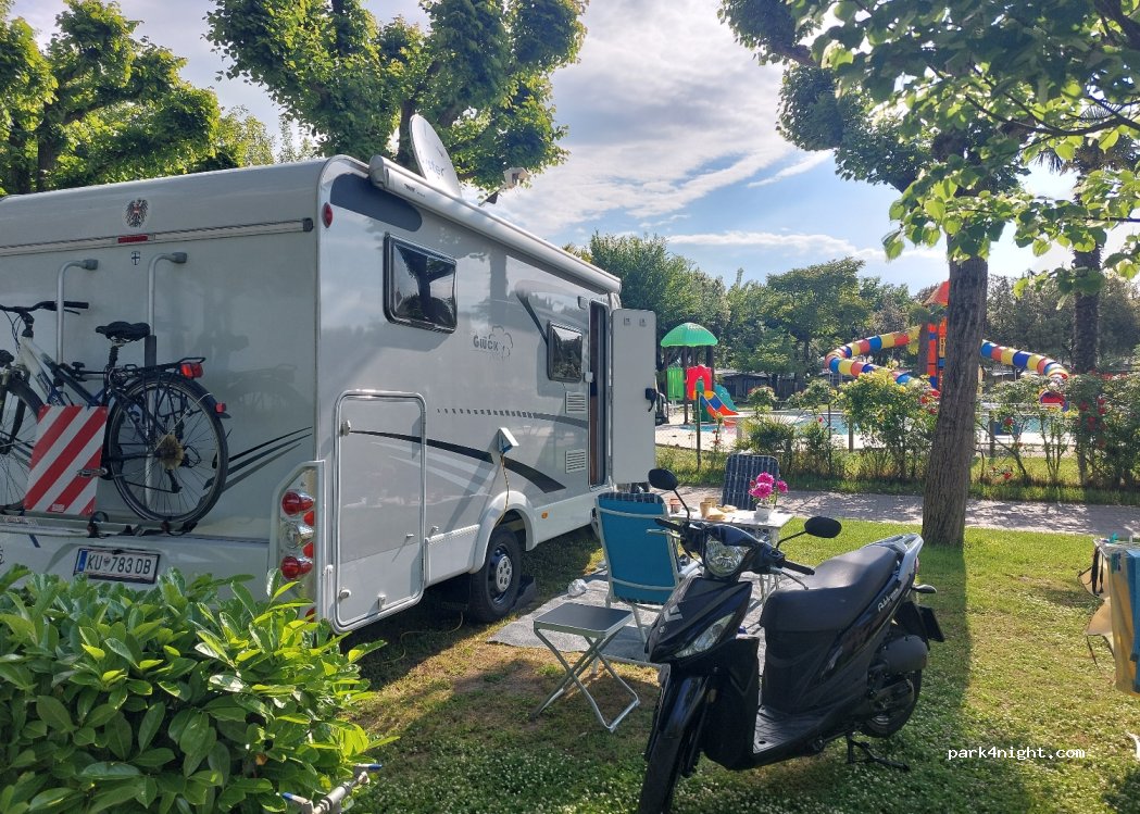 Hallo zusammen! Mücken, Mücken Mücken!!!!! Waren mit unseren beiden 4-jährigen Enkeln von 30.08. bis 03.09.2023 dort. Stellplatz Park & Aqua (429). Zum Strand ein nur für Campinggäste zugänglicher Fußweg mit (freundlichem & und stets lächelndem) "Wächter" von ca. 500 m, davon 300 m durch einen Hain, zum "Teutonenstrand". Baden war sehr schön, klebrig & warm (26 Grad). Der feine Sand klasse, besonders für die Sandburg bauenden Kinder. Da der Fußweg um 19.30 h gesperrt ist, nix mit Sonnenuntergang am Meer, da danach Rückweg versperrt. Nur 2 Toiletten und 3 Waschgelegenheiten im Halbfreien für mehr als 100 Gäste im Areal Aqua-Park. Kaltwasser bis auf Geschirrwaschplatz ...da gibt's heißes Wasser satt. Dusche mit Jeton 0.50 € am Automaten zu lösen; Duschzeit mehr als ausreichend. Oft wurden die Marken nicht "abgeduscht" und es kam noch reichlich Warmwasser. Aufgrund der Mückenplage könnten wir kaum draußen vor dem Womo sitzen. 2 mal pro Woche fährt ein Traktor durch den Platz und versprüht mit einem großen Vaporisator großzügig Insektengift auf Bäume, Camper und Gäste. Der schöne Pool (auch ein Kinderpool vorhanden) mit 2 großen Rutschen im Gegensatz zum Meer saukalt. Die dort üppig vorhandenen Liegen und Sonnenschirme kosten natürlich extra. Darüber wacht peinlich genau der "Pool-Assistance". Im sonstigen Liegebereich für Decken & im Halbschatten herrschen die Mücken! Dazu laute "Ballermusik" aus einem Lautsprecher auf einem Tisch stehend. Der Kinderspielplatz ganz in Ordnung, aber gut bespielt. Eine große Voliere mit Papageivögel/Kanaries an einem Kinderspielplatz zu bauen, grenzt m.E. an Tierquälerei, da die Kinder "natürlich" auf der Voliere "herumhämmern" und ihren Spaß an den aufgeregt flatternden Vögeln haben. Animationsprogramm italienisch schrill bis peinlich "hulligullu hulligulli hulli-ramtamtam - Arabi Arabi …". Ein kleiner Supermarkt ist auch da und …. na,ja - den Umständen nach preislich noch akzeptabel. 1 Liter Milch 2.20 €. Mit Womo keine andere Einkaufsmöglichkeit, da die via Corer weit weg von Jesolo in einem eigenen Stadtteil. Die dortige Gastwirtschaft nicht genutzt, ebenso wenig wie das Automatenangebot für Kinder/Jugendliche. Am Platz Wasser & Abwasserversorgung; Chem. Toilettenentsorgung ausreichend vorhanden. Problematisch war das Einchecken mit Wohnmobil, da auf der Durchgangsstraße oder einem mit Pkw reichlich gefüllten Parkplatz gewartet werden musste, bis man dran war. Dagegen war die Abreise unproblematisch bis 16.00 h möglich. So konnten wir vormittags noch mal ans Meer. Für mich ist dieser Campingplatz eine einmalige Geschichte gewesen. Servus zusammen!
