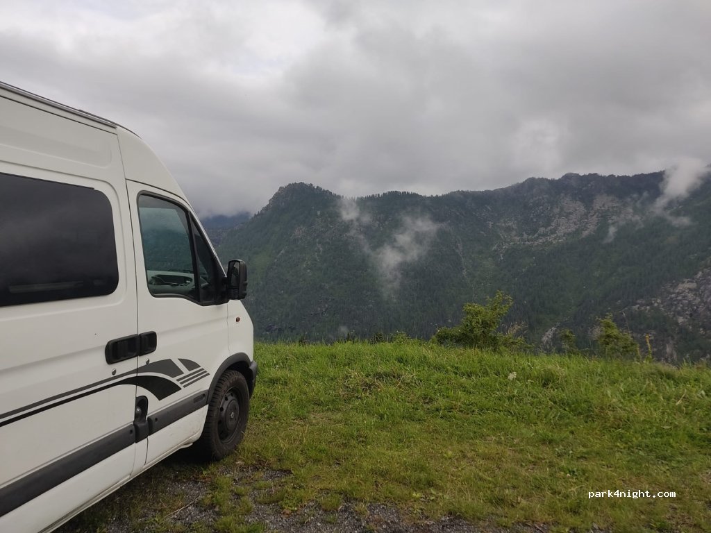 Parking en pente (calages nécessaires) au calme en bord de route, avec une vue magnifique sur les montagnes, d'où surgissent de petites cascades naturelles. excellent point de départ pour des excursions.