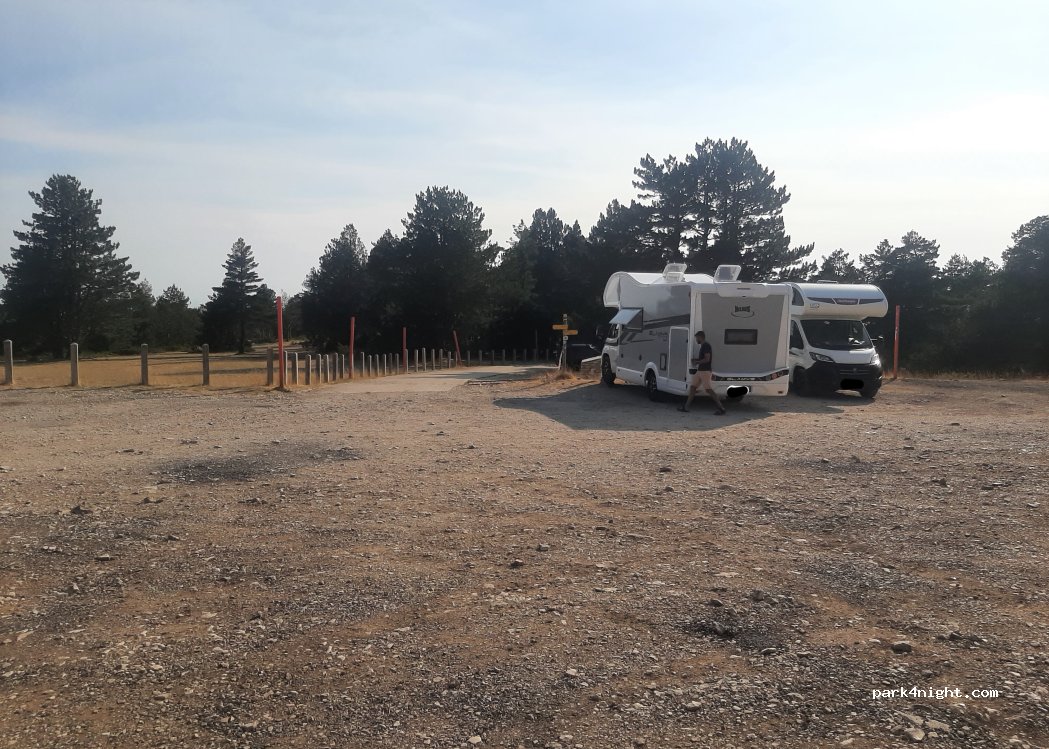 Immense parking dans une aire naturelle sans aucun service. Calme assuré et paysage magnifique avec le sommet du mont Ventoux comme point de vue.