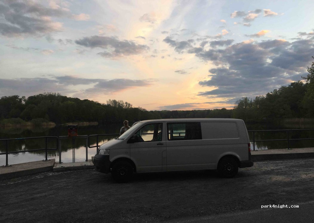 Small parking lot right on the lake. There is also a small spot where you can go swimming (100m clockwise along the lake) There are few cars passing by at night. The only disadvantage now and then is it stinks from the small lock.