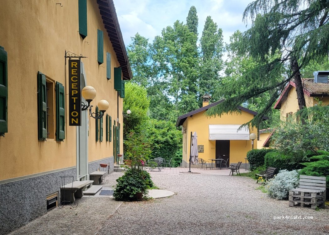 Belle aire pour camping car dans un parc arboré à côté hotel et restaurant avec tout service. 18€ la nuit électricité comprise. Allez à la réception pour ouverture de la barrière. Bus et train pour Bologne facile sur Google maps. On aimerait avoir des lieux comme ça souvent...
