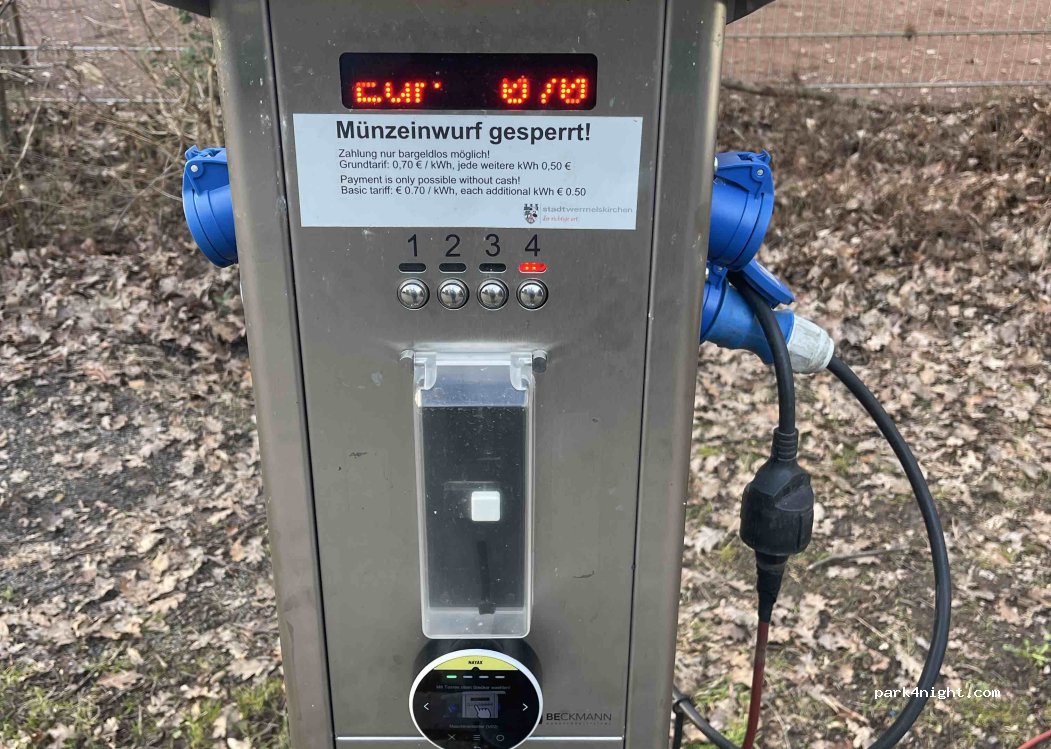 Stromsäule mit 4 Anschlüssen für aktuell 0,70€ pro KWh. Bezahlung nur per Karte EC/Visa. Funktioniert folgendermaßen: Stecker per Taste z.B. Taste 3 durch drücken auswählen. Selbe, also Taste 3 drücken um den Betrag einzugeben. Also 1x drücken 0,70€, 2x drücken 1,40€ usw. Anschließend Karte vor das Lesegerät halten. Fertig. Die ausgewählte Steckdose ist nun Aktiv.