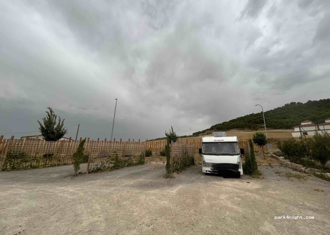 Área de tierra, con ligera pendiente (no impide dormir) y según donde aparques puedes obstaculizar el acceso a una báscula. Tiene lo suficiente pasar una noche tranquila y el pueblo merece la visita
