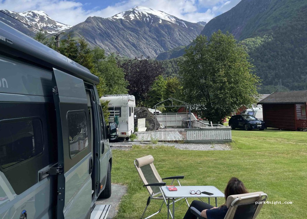 Camping is voornamelijk gericht op vaste plaatsen en huisjes. Wel een aantal vrije plekken voor campers. Sanitair is schoon en prima. douche gratis. Vijf minuten lopen naar fjord. Dorp ligt erg rustig verscholen aan het water. Ondanks dat de camping niet pal aan het water ligt, is het wel de moeite waard. Het ligt schitterend tussen de bergen. 270 kroon per nacht inclusief stroom.