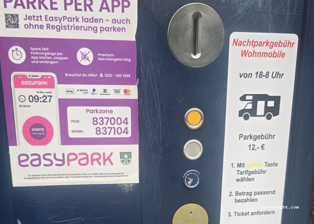 Großer ebenener Platz. In der Nacht sehr ruhig. Man hört lediglich den Bach. In der extra vorher heruntergeladenen App konnten wir keinen Nachttarif finden. Hatten dann in der App die Parkzeit von späten Abend bis ftühen Morgen eingestllt. Dafür wurde 0€ angezeigt.