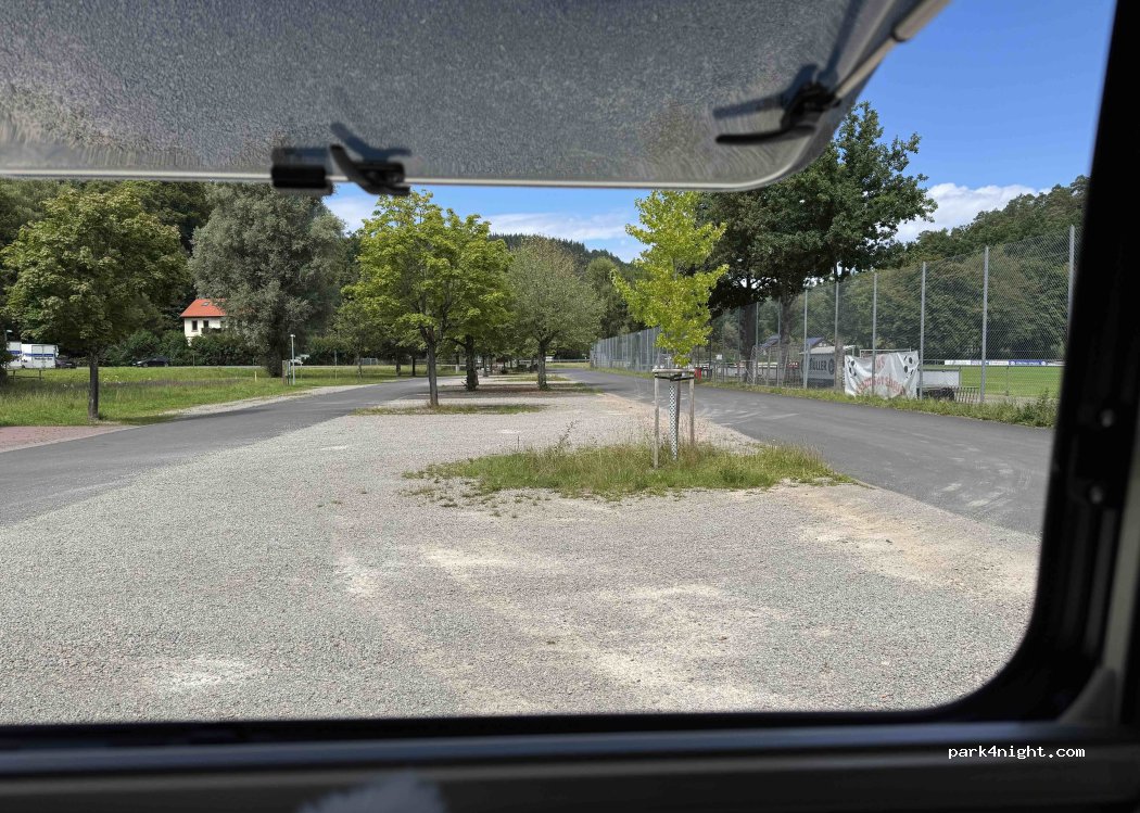 Platz gegenüber Sportplatz. Über die Straße Brauerei mit Gasthaus und Biergarten. Sehr lecker. Nachts ruhig trotz Straße.