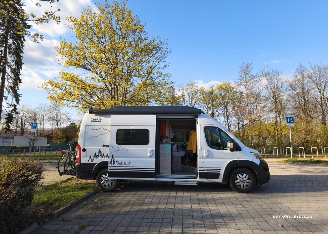 Parking lot close to the city (5 min by bike) directly at the beautiful outdoor pool and at the soccer field. Shops nearby. Some cyclists and walkers during the day, quiet at night.
