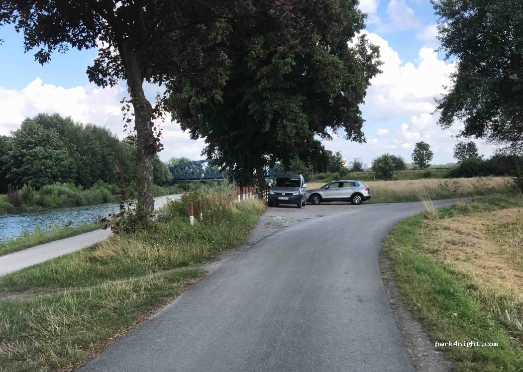 Questo parcheggio è in ghiaia direttamente sul canale Datteln-Hamm. È leggermente/minimamente in pendenza. Si trova sulla famosa pista ciclabile lungo il canale Datteln-Hamm, quindi c'è molto traffico pubblico durante il giorno. Ma di notte è molto tranquillo (non so quanti treni merci ci siano sui binari nelle vicinanze, non ne ho mai sentito parlare). Piccole imbarcazioni / SUP possono essere lanciate in molti punti lungo il canale.