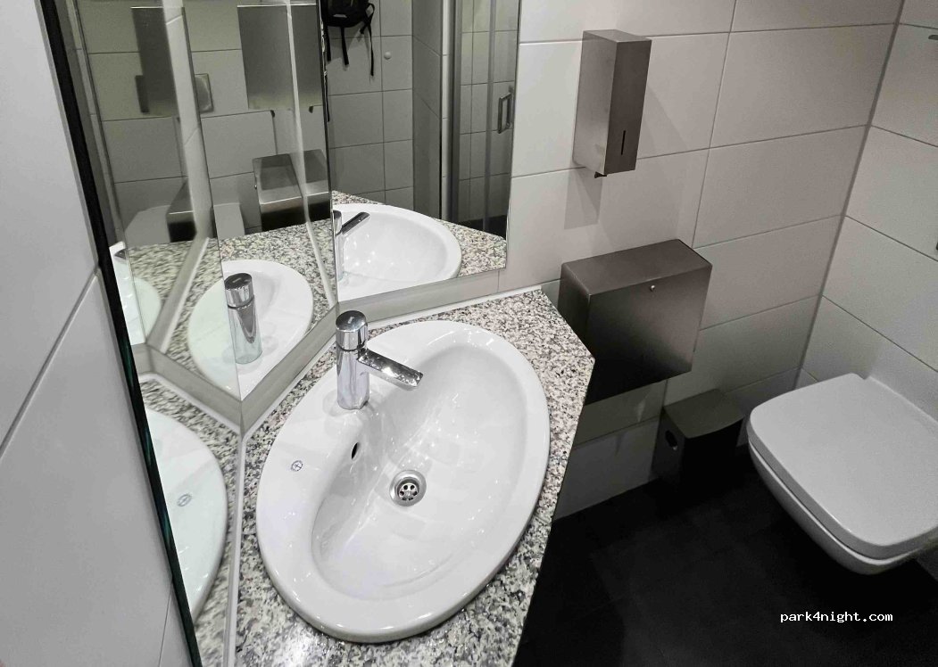 Seit meinem letzten Besuch vor zwei Jahren wurden die Duschen modernisiert. Toilette, Handwaschbecken, großer Spiegel, Mülleimer - alles da und alles sauber. Mit kleineren Fahrzeugen parkt man natürlich nicht auf dem LKW-Parkplatz, sondern vor dem Restaurant. Zum übernachten geht's dann doch auf den kostenpflichtigen LKW-Parkplatz. Ich war nur zum duschen hier.