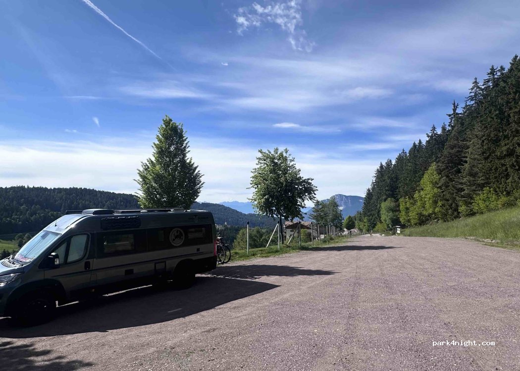 Passato 2 notti. Ingresso con stanga automatica e telecamera, costo 4 euro al giorno. Pagamento all'uscita. Molto Tranquillo per la notte. Vista top sulla vallata! Da lì partenza sentieri e possibilità passeggiate. Recinto con daini vicino al parcheggio e mucche poco sopra Bellissimo e consigliato!!