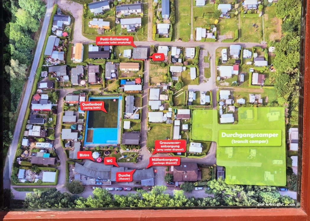 lovely small camping site with everything you need. was greeted by a very polite gentleman at the front desk. very quiet and green very clean facilities. Not very far from Hamburg. 2x persons + 1 campervan 32euro.