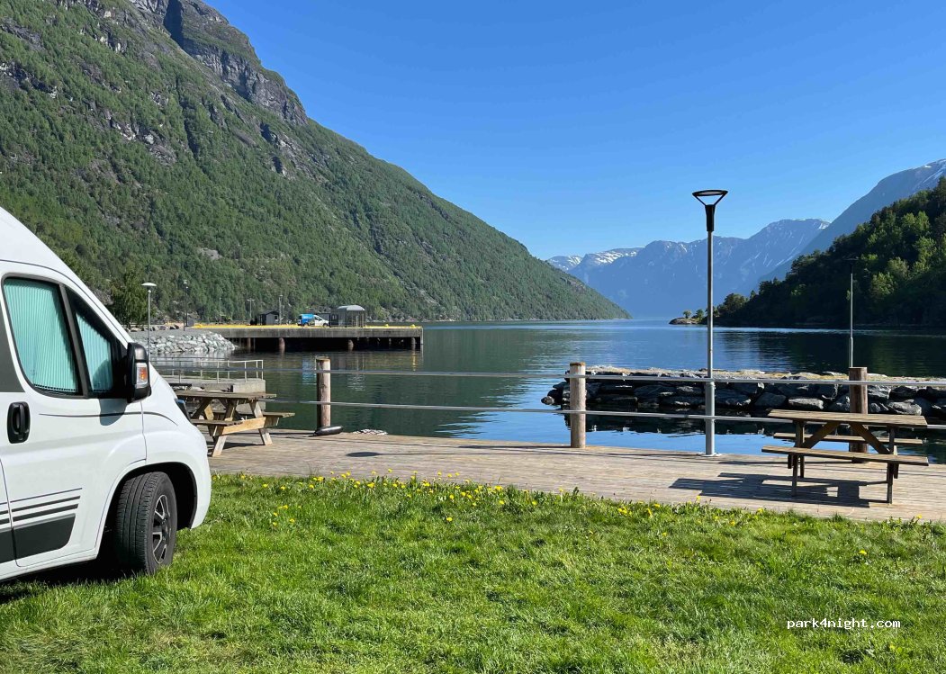 Super emplacement libre à côté de l’embarquement pour faire une mini croisière jusqu’à Geiranger soit avec le camping-car ou un aller -retour en piétons pour la journée . très pratique et nous eu un accès chaleureux